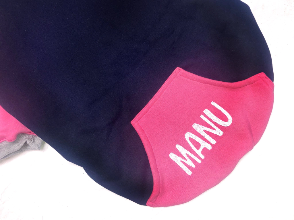 Agasalho em moletom flanelado azul marinho com mangas e bolso em rosa chiclete, touca em cinza mescla, forro da touca em malha 100% algodão cinza mescla, bordado com o nome do pet em branco no bolso e acabamento da barra e das mangas em ribana cinza. Fechado na frente. Informar no campo "Comentários adicionais" na página de finalização do pedido o nome a ser bordado.