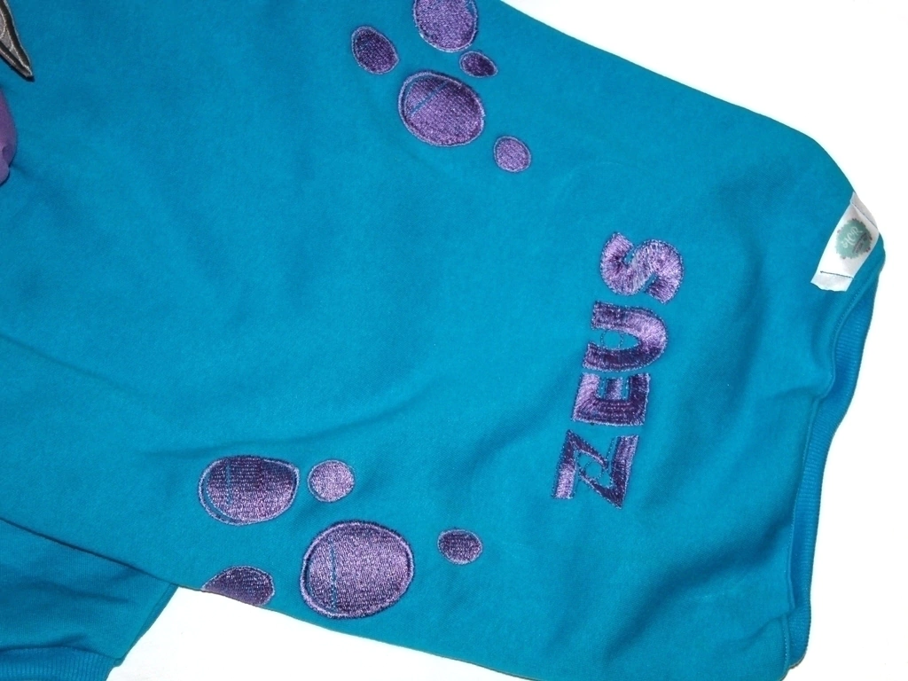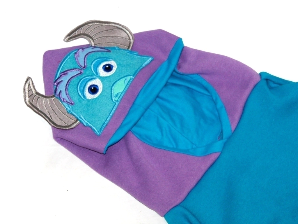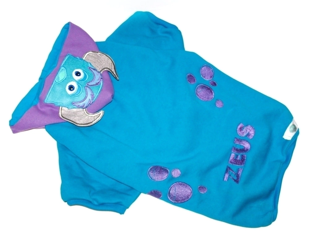 Agasalho em moletom flanelado azul turquesa e lilás, forro da touca em malha de algodão azul turquesa, bordado com o rosto do personagem Sullivan na touca, pintinhas nas costas e com o nome do pet em lilás. Acabamento da barra e mangas em ribana azul turquesa. Fechado na frente. Informar no campo "Comentários adicionais" na página de finalização do pedido o nome a ser bordado.