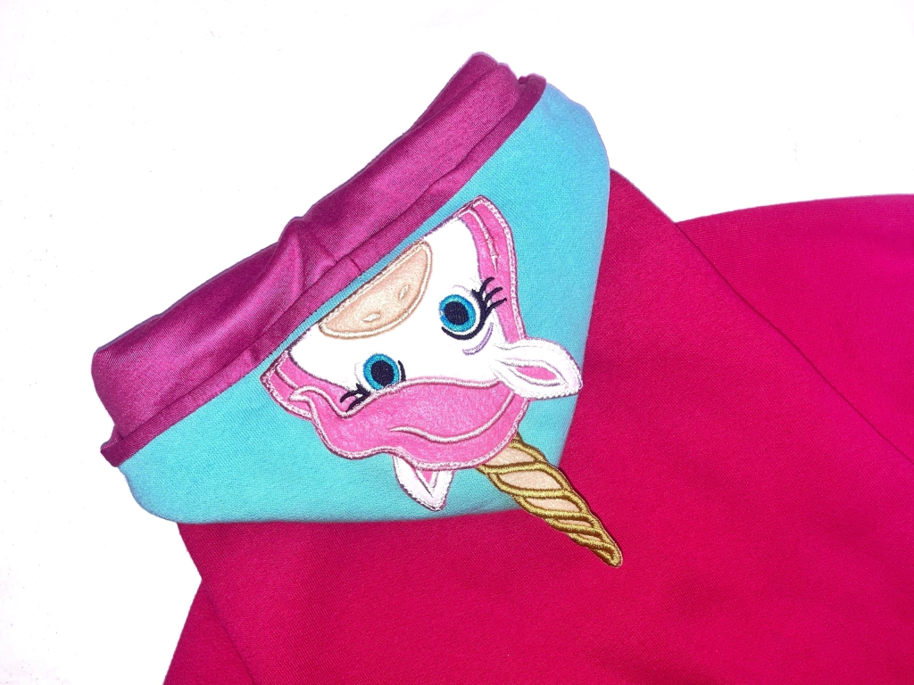 Agasalho em moletom flanelado pink e verde água, forro da touca em malha de algodão pink, bordado com o rosto de unicórnio na touca e o nome do pet verde água com um unicórnio nas costas. Acabamento da barra e mangas em ribana verde água. Fechado na frente. Informar no campo "Comentários adicionais" na página de finalização do pedido o nome a ser bordado.