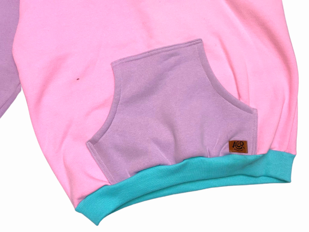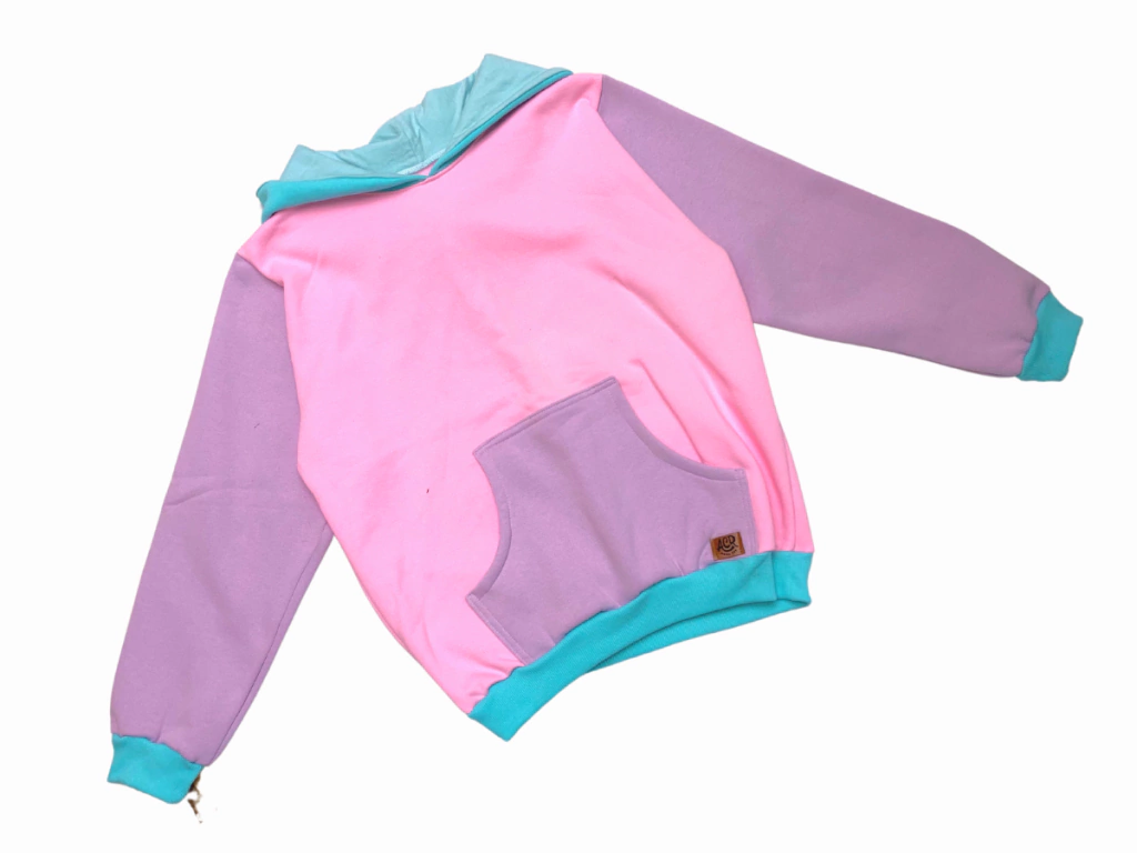 Agasalho em moletom flanelado rosa bebê com mangas e bolso em lilás, touca em verde água, forro da touca em malha de algodão verde água, opção de bordado com a frase "Humano/a da/o + nome do pet" em verde água nas costas e acabamento da barra e das mangas em ribana verde água. Fechado na frente. Informar no campo "Comentários adicionais" na página de finalização do pedido o nome a ser bordado.