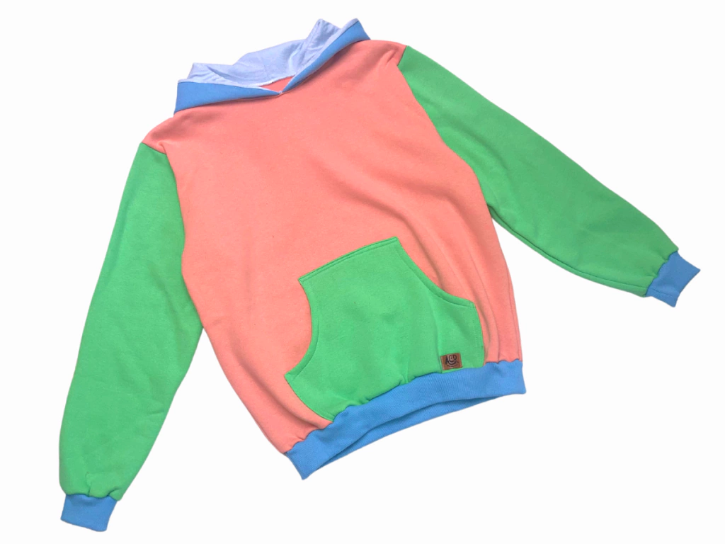 Agasalho em moletom flanelado salmão com mangas e bolso em verde menta, touca em azul bebê, forro da touca em malha de algodão azul bebê, opção de bordado com a frase "Humano/a da/o + nome do pet" em azul bebê nas costas e acabamento da barra e das mangas em ribana azul bebê. Fechado na frente. Informar no campo "Comentários adicionais" na página de finalização do pedido o nome a ser bordado.