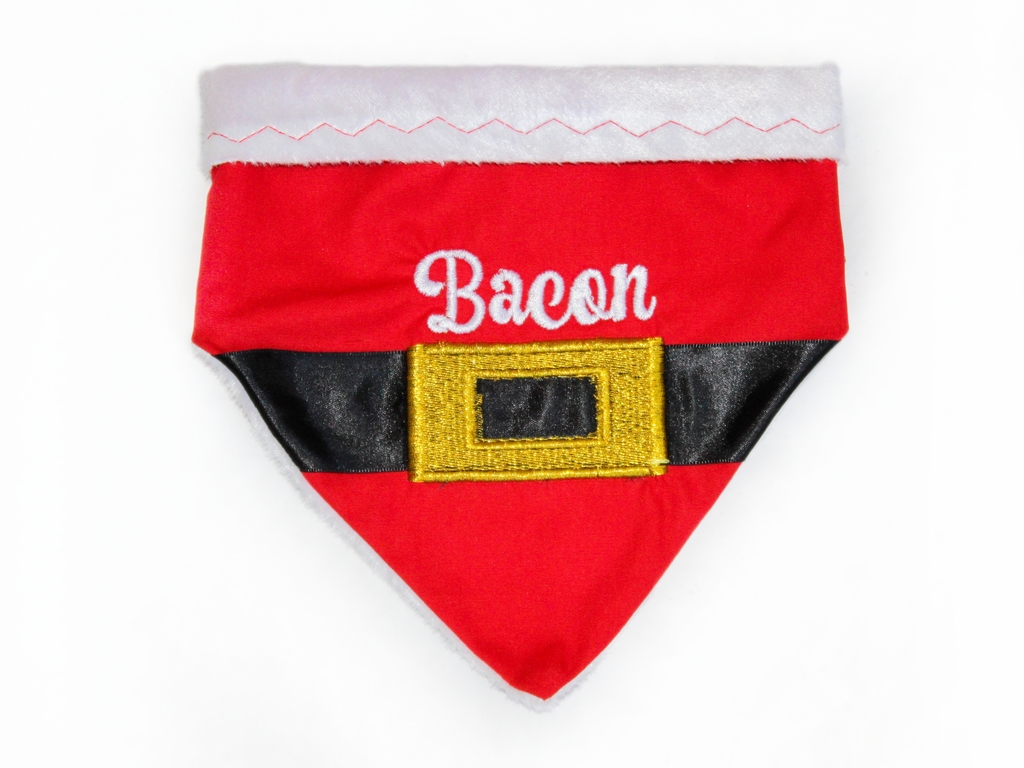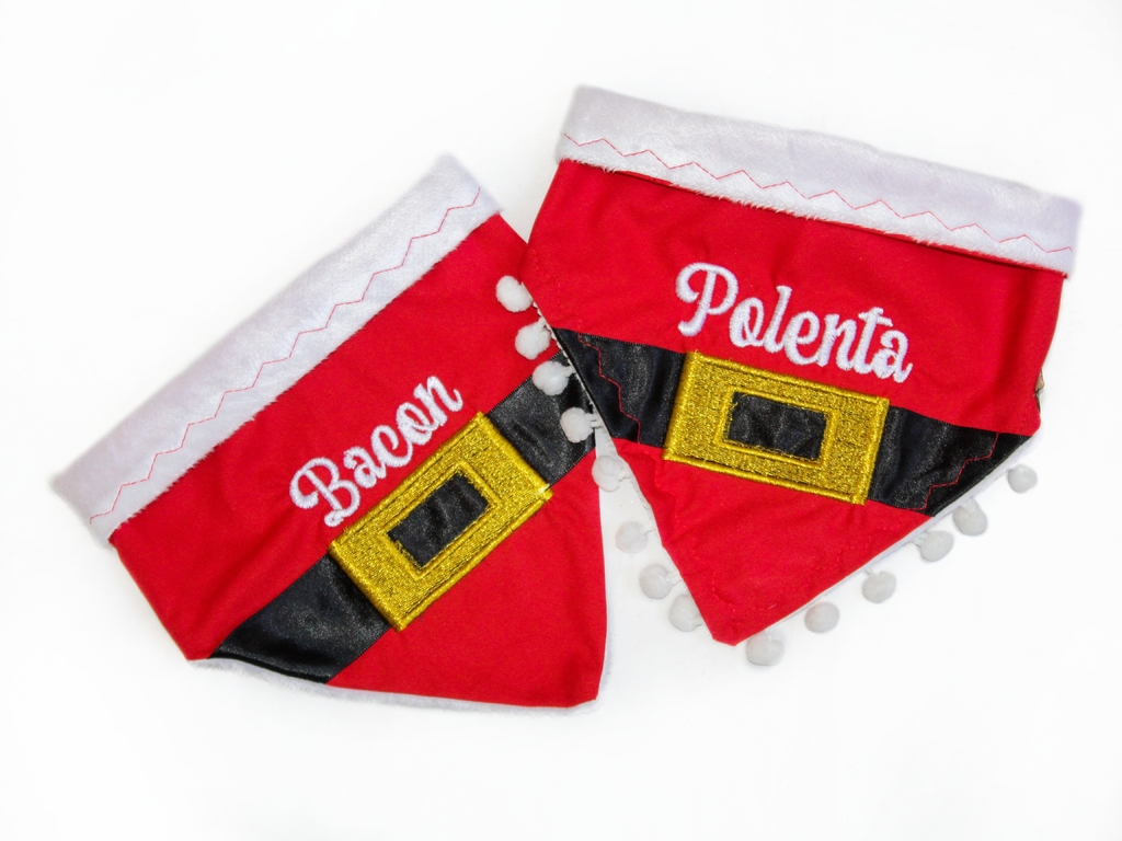 Bandana dupla face confeccionada de forma artesanal em tricoline 100% algodão, velboa branca, fita de cetim preta e bordado de fivela dourada e nome do pet em branco. Fechamento em botões de pressão de plástico com 2 regulagens. O padrão da estampa pode variar de acordo com o corte do tecido. Informar no campo "Comentários adicionais" na página de finalização do pedido o nome a ser bordado. Este anúncio refere-se apenas a bandana de Papai Noel, a bandana de Mamãe Noel com acabamento em pompom é vendida separadamente.
