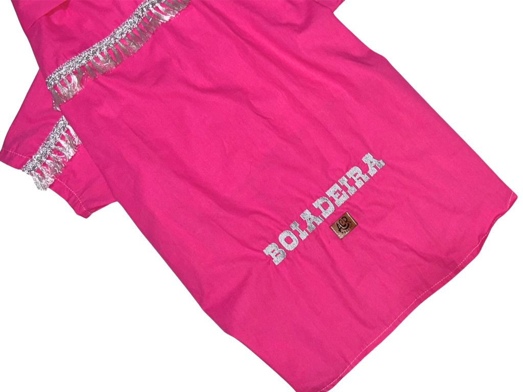 Camisa confeccionada de forma totalmente artesanal em tricoline 100% algodão e acabamento em franjas pratas. Possui bordado nas costas com escrita "Boiadeira" em prata. Fechamento frontal com botões de pressão. O padrão da estampa pode variar de acordo com o corte do tecido.
