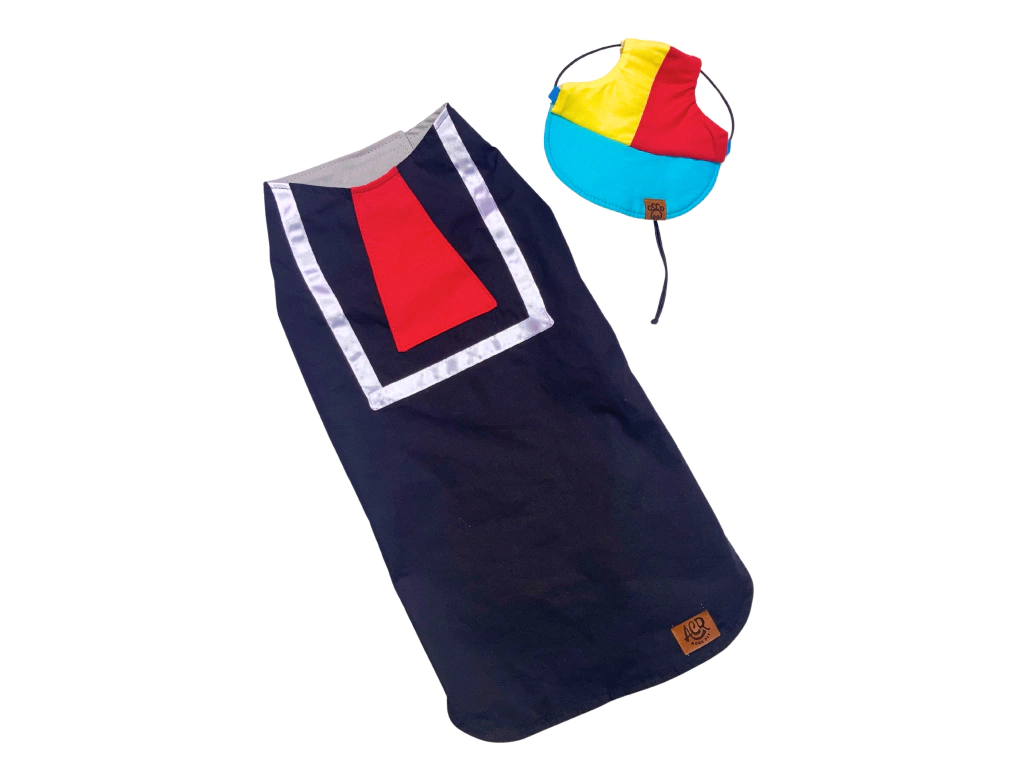Colete confeccionado de forma artesanal em tricoline misto e detalhe de gravata. Fechamento no pescoço e tórax com velcro. O padrão da estampa pode variar de acordo com o corte do tecido. O boné é vendido separadamente0