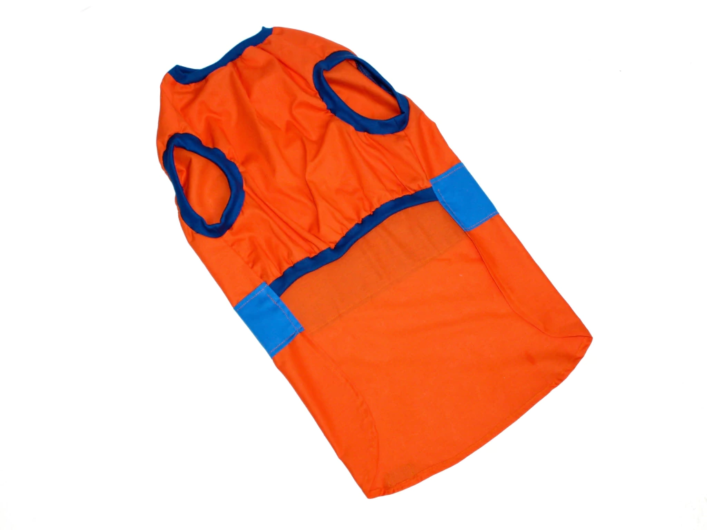 Fantasia confeccionada de forma totalmente artesanal em tricoline 100% algodão, acabamento em ribana azul, detalhe em feltro e bordado nas costas. Fechado na parte frontal. O padrão da estampa pode variar de acordo com o corte do tecido.