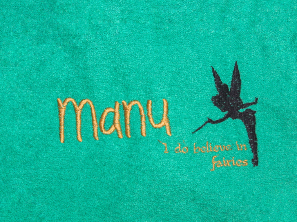 Roupão confeccionado de forma artesanal em tecido atoalhado 100% algodão, forro da touca e cinto em tricoline 100% algodão e acabamento em viés verde. Possui touca com bordado do rosto da Sininho. Opção do nome do pet bordado nas costas em dourado + sombra Sininho com frase "I do believe in fairies". Fechamento no pescoço através de botões de pressão com dupla regulagem. Tórax regulável através do cinto. Informar no campo "Comentários adicionais" na página de finalização do pedido o nome a ser bordado.
